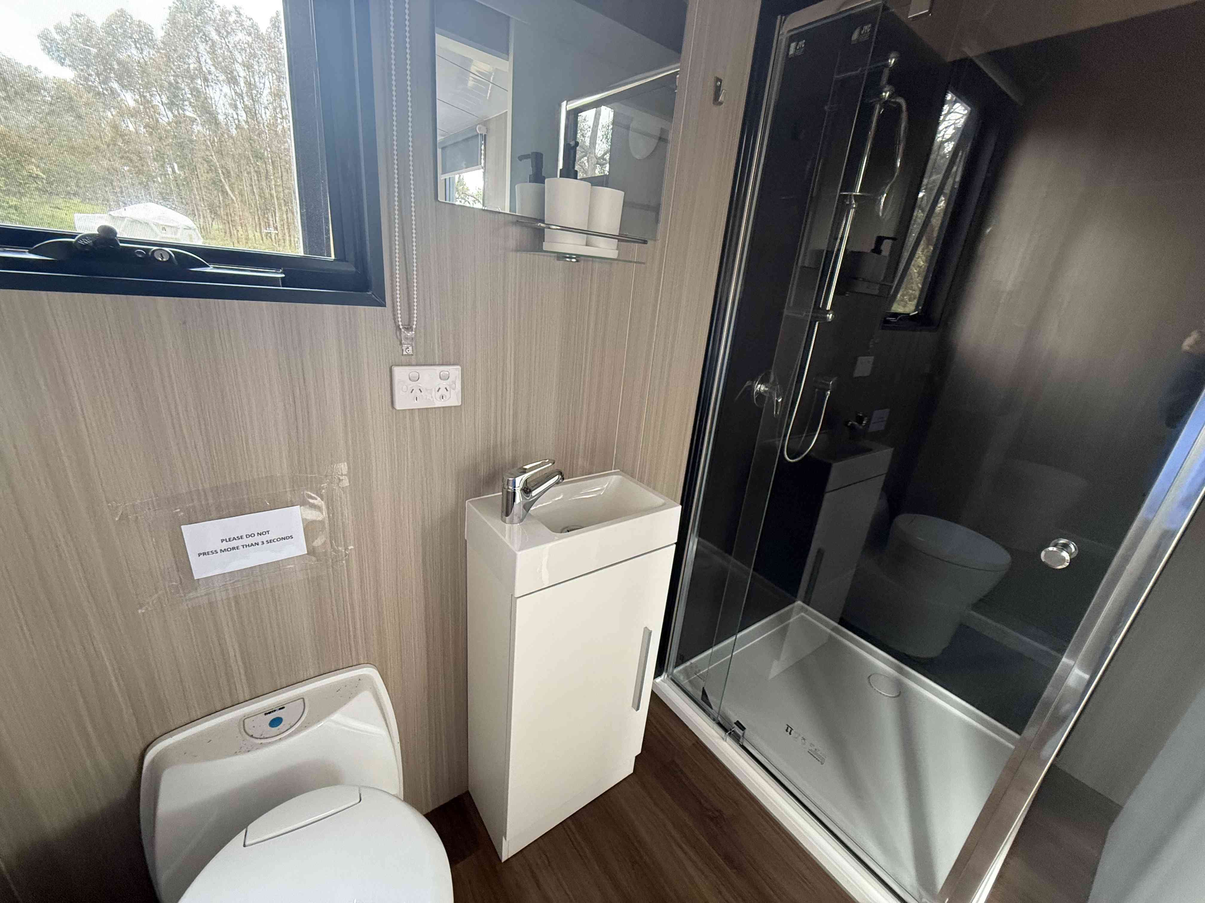 A cozy 139-square-foot tiny home with easy access to water, split air conditioning, a kitchenette, cooking equipment, and excellent bathroom facilities. These amenities include an eco-friendly cassette toilet with a removable waste holding tank, hand basin, and gas-heated shower—making it a perfect choice among relaxing holiday homes.