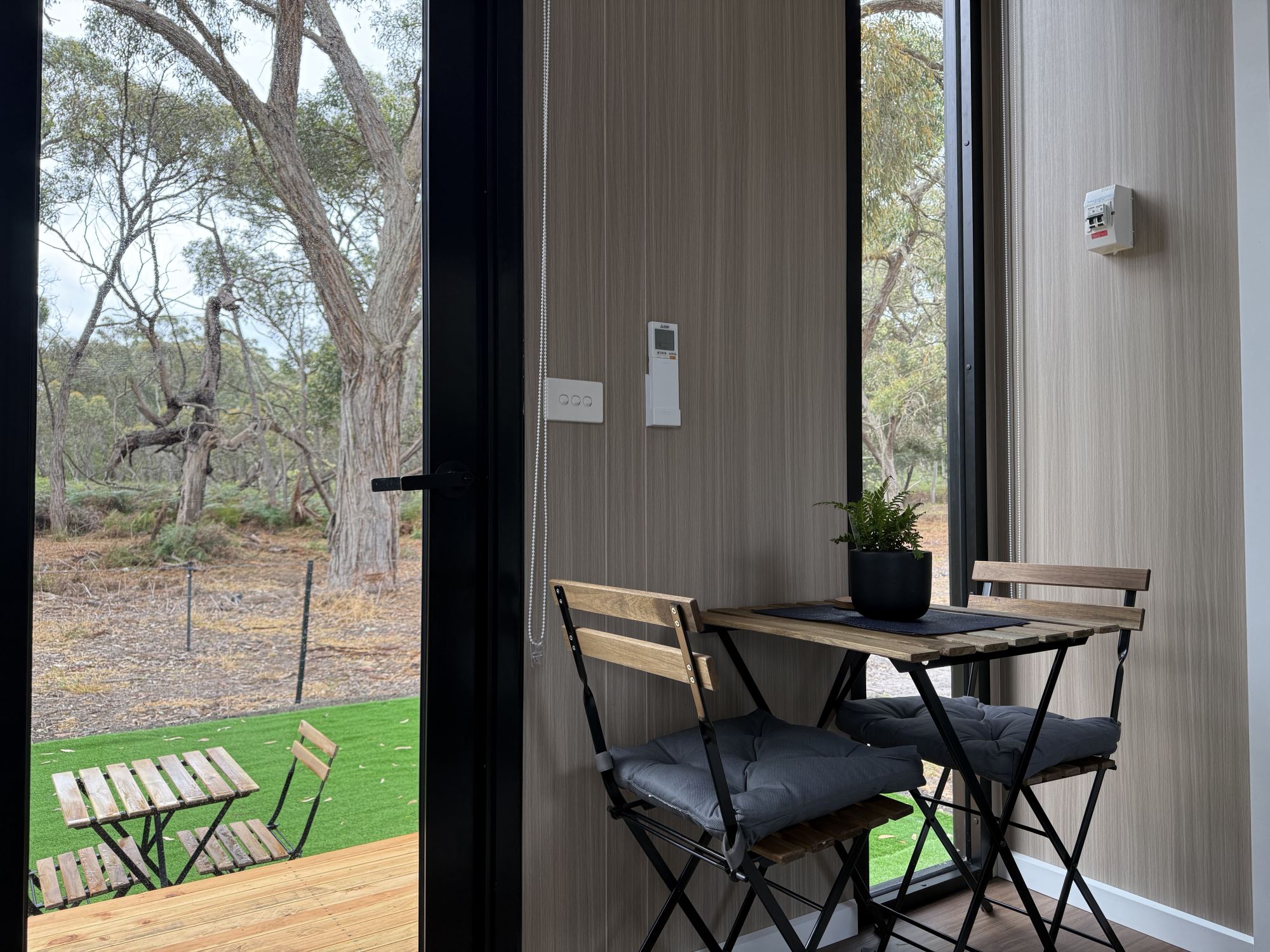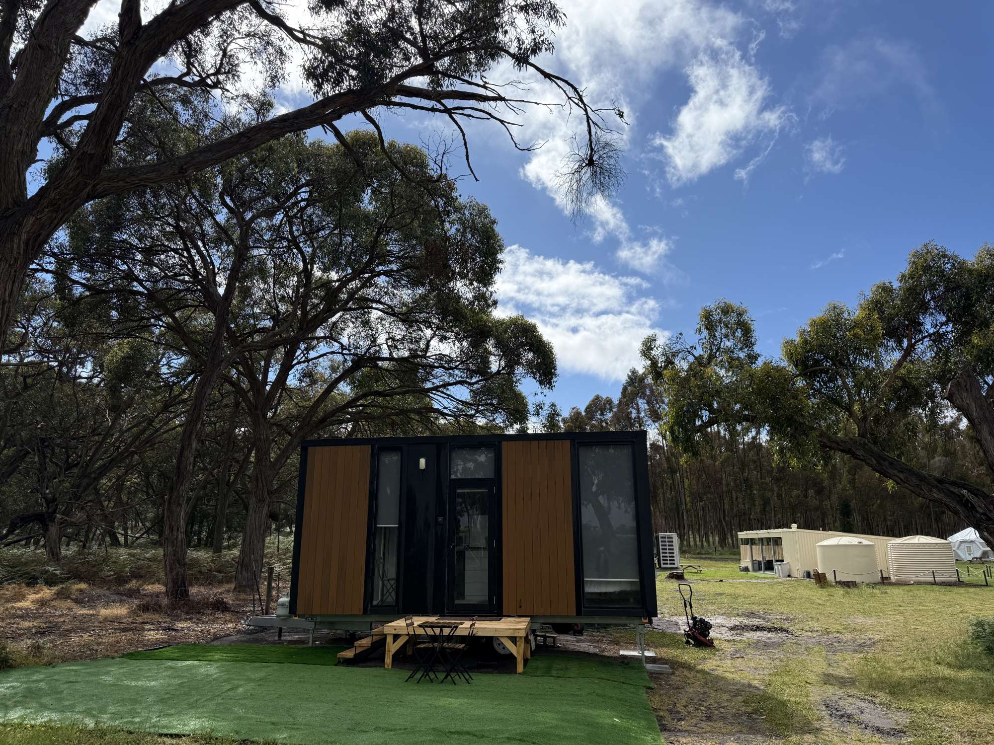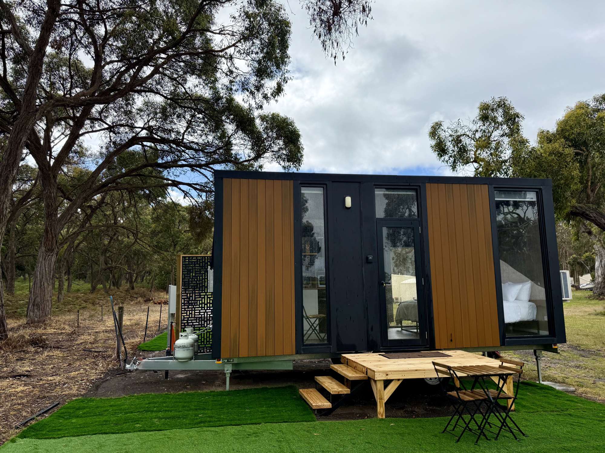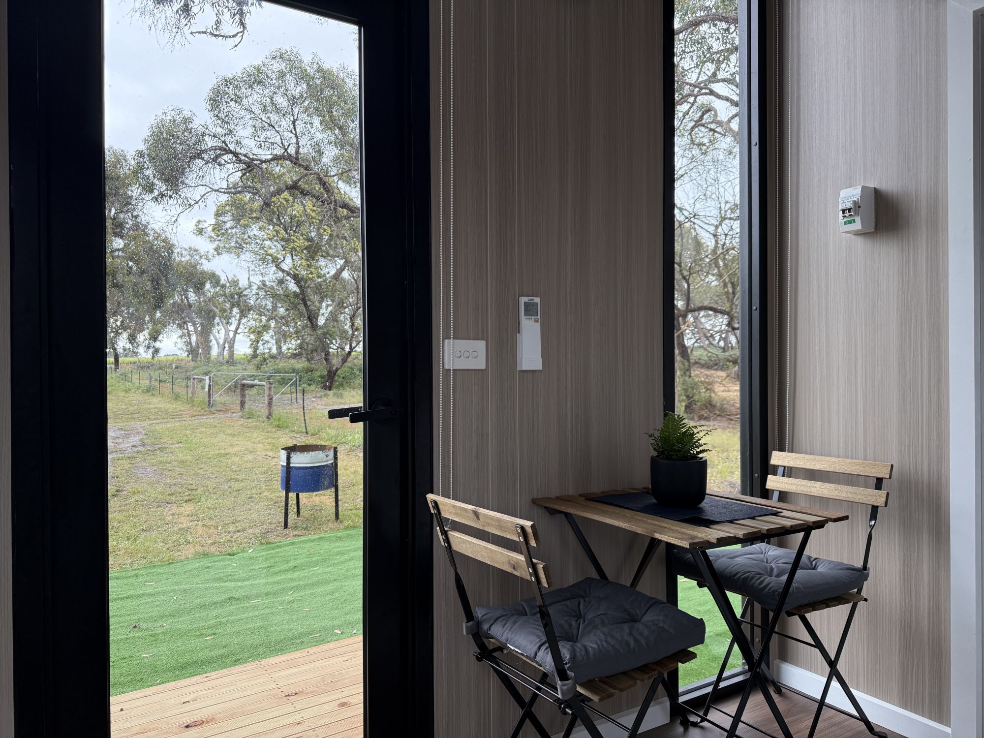 The two Bush Hideaways at Coonawarra Bush Holiday Park offer a peaceful retreat in Coonawarra, Australia. Our tiny houses are set in a secluded space with the perfect balance of comfort and tranquility. Air conditioning, heating, full bathroom, kitchenette, tea and coffee included. Fire drum and picnic table outside.